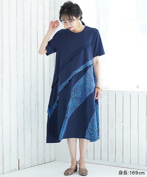 異素材切替幾何学プリント半袖ラウンドネックAラインワンピース 36-1070