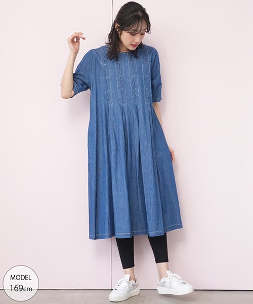 綿100%タックデザインAラインデニム風ワンピース 33-0362