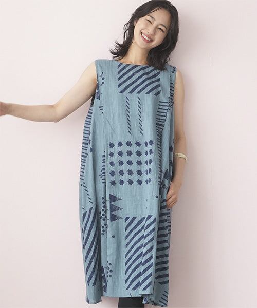 綿100%幾何学プリントノースリーブAラインワンピース 33-0372