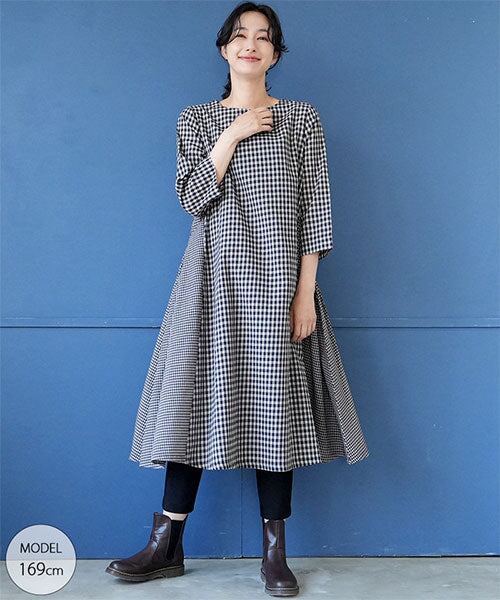 綿100%ギンガムチェック切替7分袖Aラインワンピース 36-1629