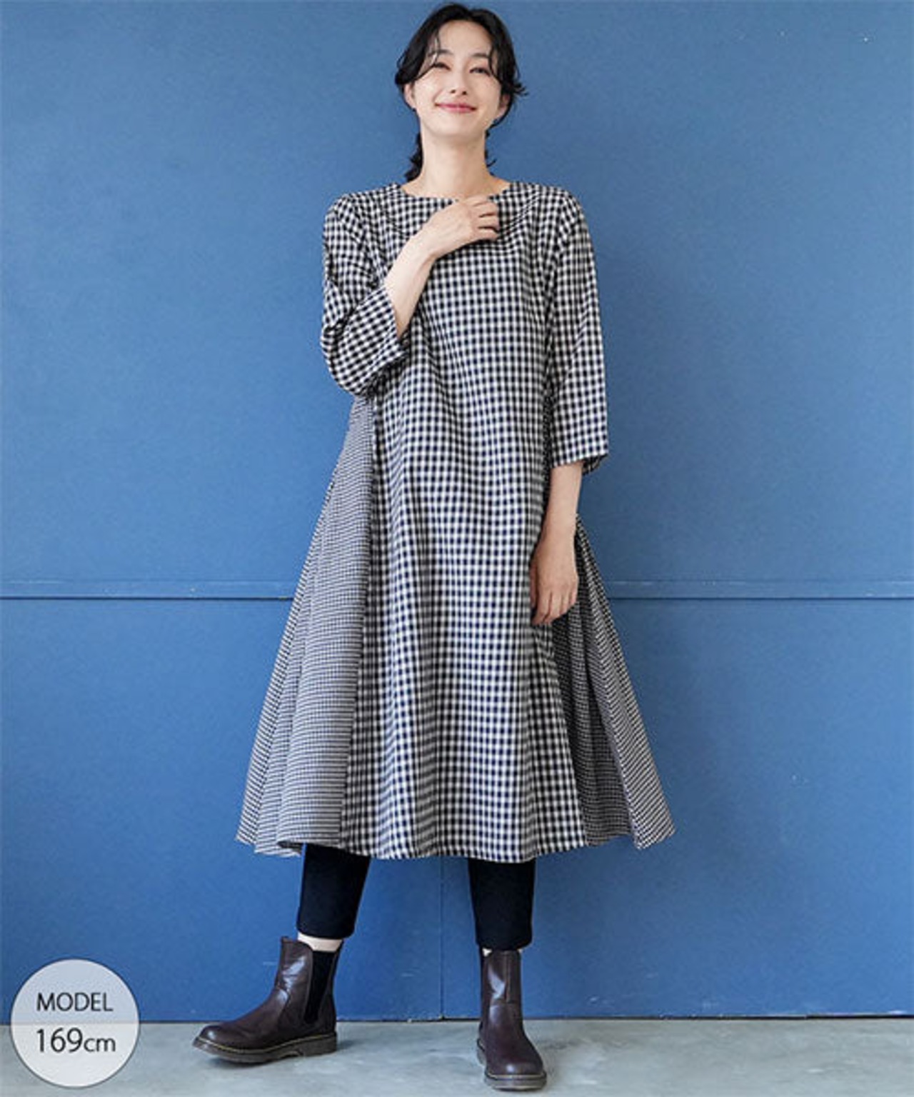 大きさ違いのギンガムチェックを切り替えた7分袖ワンピース。 ゆったり広がるAラインシルエットがボディラインを包み込んでくれます。 両サイドには便利なポケット付き。ストレスフリーな着心地でデイリーに着まわしたい1枚。 ボトムやレギンスを合わせることでコーディネートの幅が広がります。